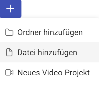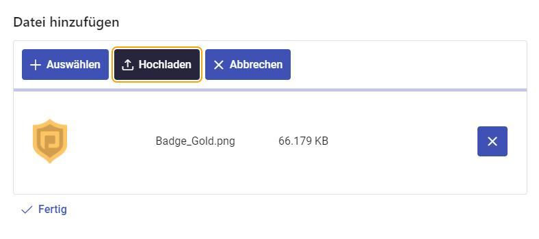 Um eine Datei hochzuladen, klicken Sie auf das Plus und wählen Sie die Option „Datei hinzufügen". Wählen Sie die gewünschte Datei aus und vergessen Sie nicht, auf Hochladen zu klicken, bevor Sie mit Fertig bestätigen!