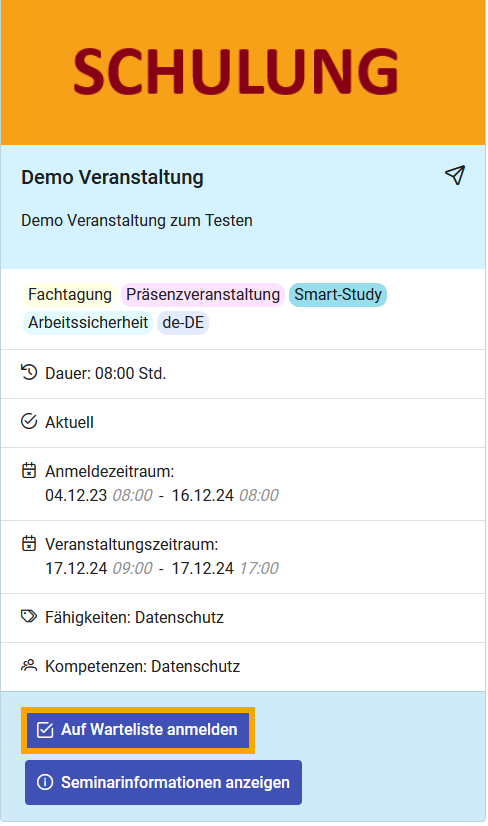 Sollte es sich um eine Veranstaltung mit einer Teilnahmegrenze handeln und die Teilnahmeplätze bereits vollständig ausgebucht sein, dann können Sie sich auch für die Warteliste anmelden. Sollte ein anderer Mitarbeiter oder eine Mitarbeiterin absagen, rückt die nächste Person auf der Liste automatisch nach und wird per E-Mail eingeladen.