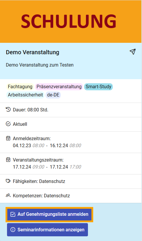 Um sich für ein genehmigungspflichtiges Seminar anzumelden, gehen Sie zunächst im Menü auf den Punkt Fortbildungsangebot. Dort werden Ihnen alle Seminare angezeigt. Wählen Sie eines aus und klicken Sie auf Auf Genehmigungsliste anmelden.