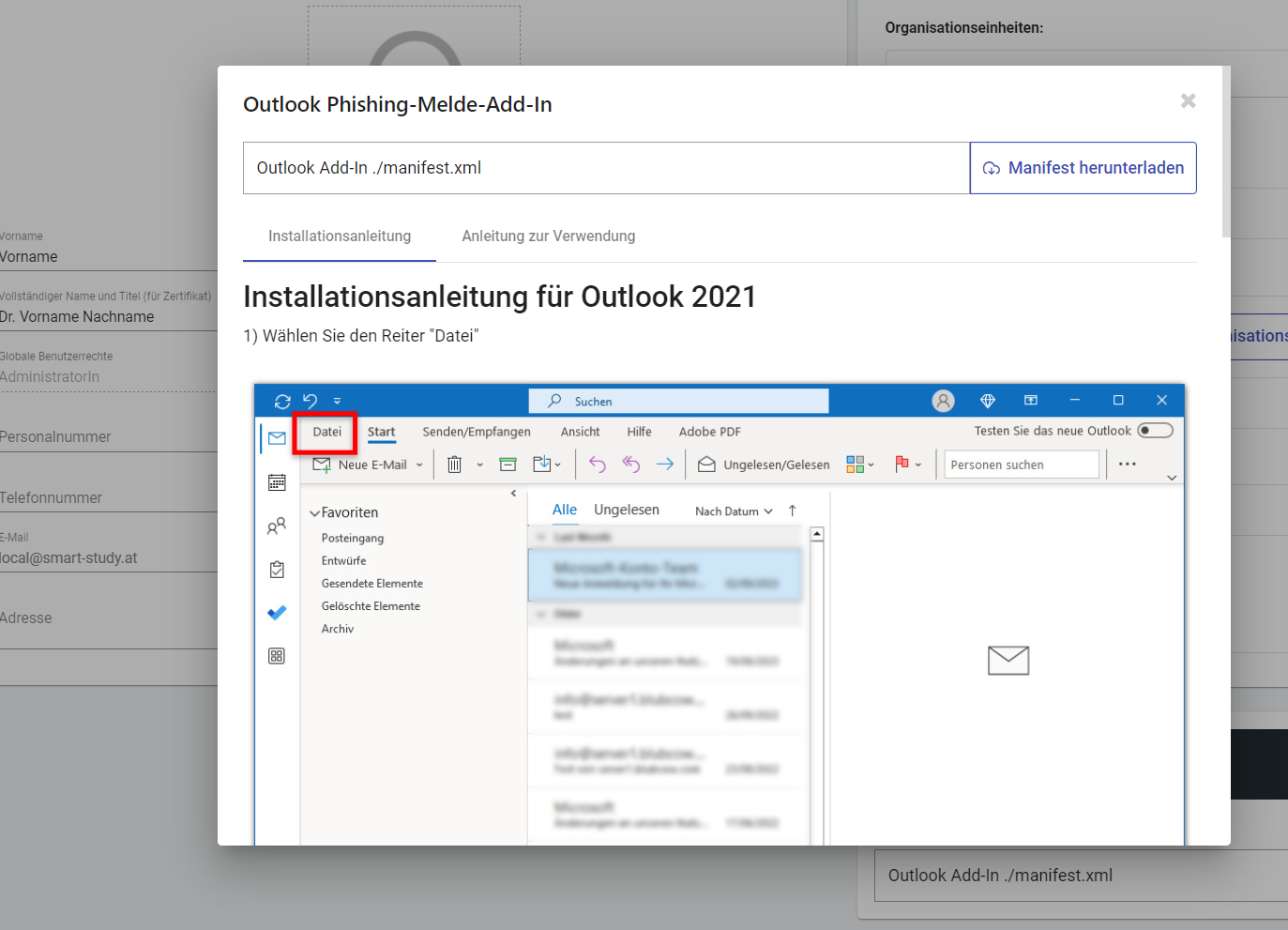 Wenn Sie das Manifest heruntergeladen haben, müssen Sie Ihr Outlook öffnen. Die weiteren Schritte werden in Installationsanleitung-für-Outlook-2021 beschrieben.