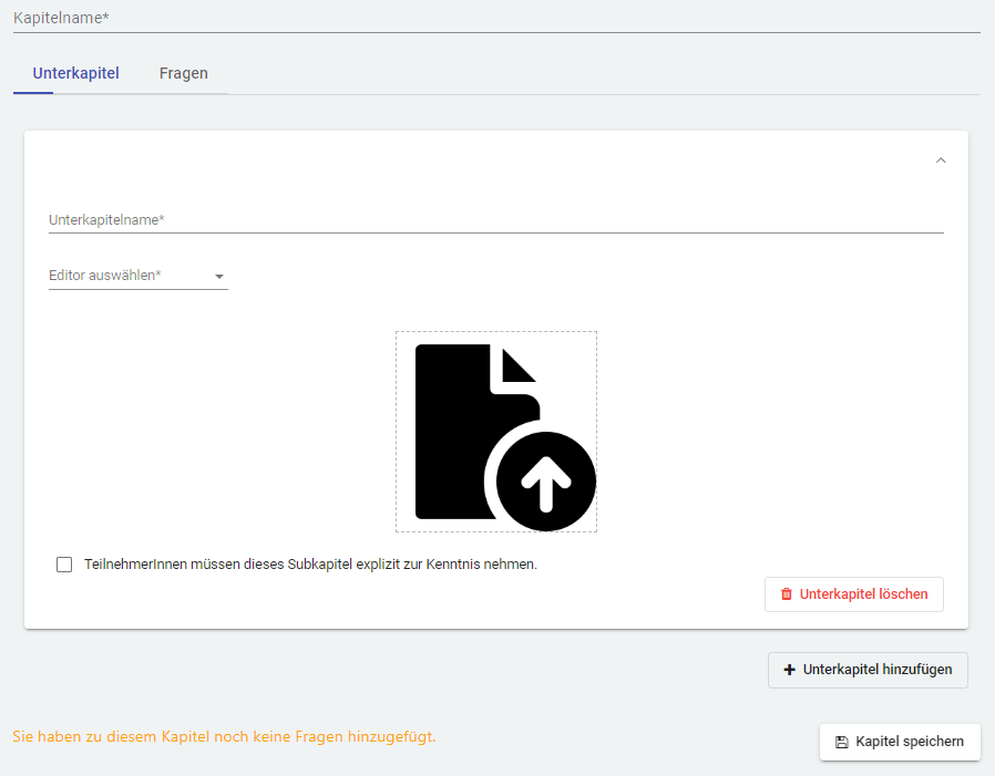 Sobald Sie Ihr Kapitel fertiggestellt haben, fügen Sie es mit ‚Kapitel speichern’ dem Kurs hinzu. Sollten Pflichtfelder nicht ausgefüllt sein, ist das Speichern nicht möglich. Fehlende Angaben sind in roter Schrift gekennzeichnet.