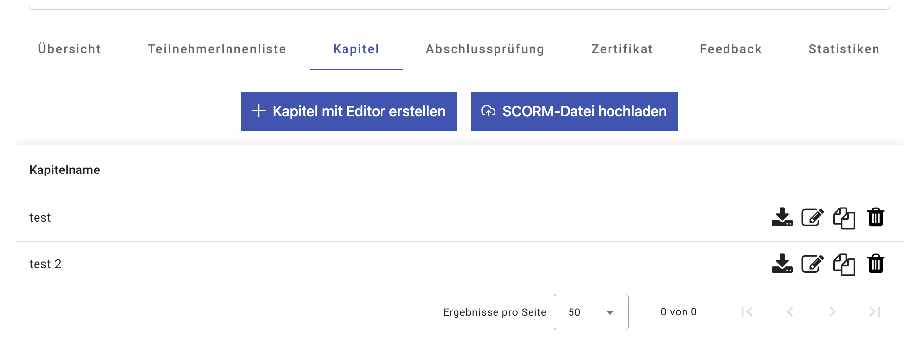 #NEU Um einen Kurs mit Inhalten zu versehen, gehen Sie zum Reiter Kapitel. Sie können beliebig viele Kapitel anlegen, in denen Sie Ihre Inhalte einspielen und unterteilen können. Dabei können Sie zwischen Kapitel mit Editor erstellen und SCORM-Datei hochladen unterscheiden.