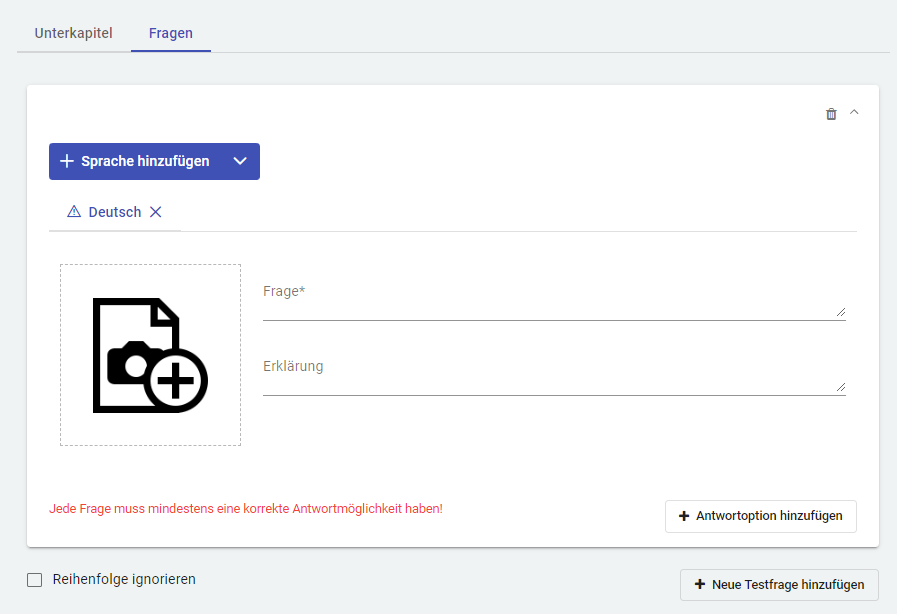 Über den Button ‚Antwortoption hinzufügen’ können Sie mehrere Antwortmöglichkeiten erstellen. Wählen Sie mindestens eine davon als ‚Richtige Antwort’ aus. Wenn Sie mehrere richtige Antworten auswählen, müssen die Teilnehmenden alle richtigen Antworten ankreuzen, um die Frage korrekt zu beantworten.