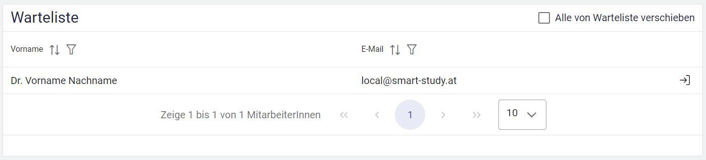 Hat ein Seminar eine limitierte TeilnehmerInnenzahl und wurde diese in Form von Anmeldungen überschritten, kommt der bzw. die Mitarbeitende auf die Warteliste. Wenn Plätze frei werden, melden Sie MitarbeiterInnen für das Seminar an, indem Sie auf den Pfeil rechts in der jeweiligen Zeile klicken und die Änderung speichern. Möchten Sie mehrere Personen auf der Warteliste für das Seminar anmelden, aktivieren Sie die Checkbox oben rechts ‚Alle von Warteliste verschieben’. Nun können Sie einzelne oder alle MitarbeiterInnen auswählen und mit ‚Ausgewählte von Warteliste verschieben’ für das Seminar anmelden.