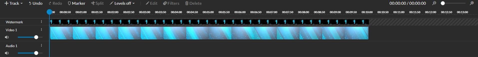 Die Timeline besteht standardmäßig aus 4 Spuren: Watermark, Text 1, Video 1, Audio 1.