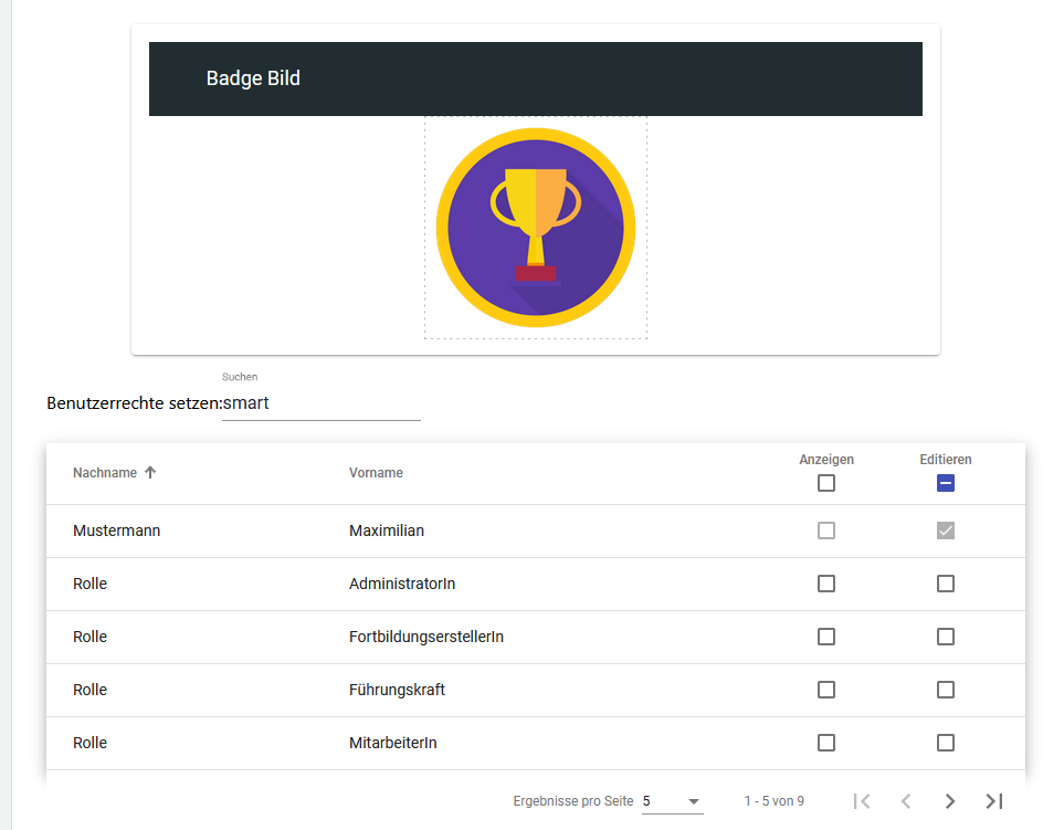 Name und Beschreibung müssen eingegeben werden. Zusätzlich kann ein Bild hinzugefügt werden. Außerdem können Rechte für den Badge vergeben werden. Klicken Sie auf Speichern und schon ist das Badge im System erstellt!