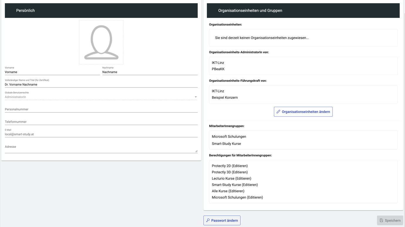 In Ihrem persönlichen Profil finden Sie Informationen wie Vorname, Name und Kontaktdaten. Außerdem können Sie ein Profilbild (im Seitenverhältnis 1:1) hinterlegen. Sie können an dieser Stelle weiterhin Ihre Benutzerrechte sehen. Grundsätzlich sind alle Beschäftigten mit den Benutzerrechten MitarbeiterIn ausgestattet. Sie können außerdem Ihre Organisationseinheiten sehen und wo Sie als Führungskraft, Administrator oder Personalverwaltende Stelle hinterlegt sind. Auch Ihre MitarbeiterInnengruppen sind hier aufgelistet.