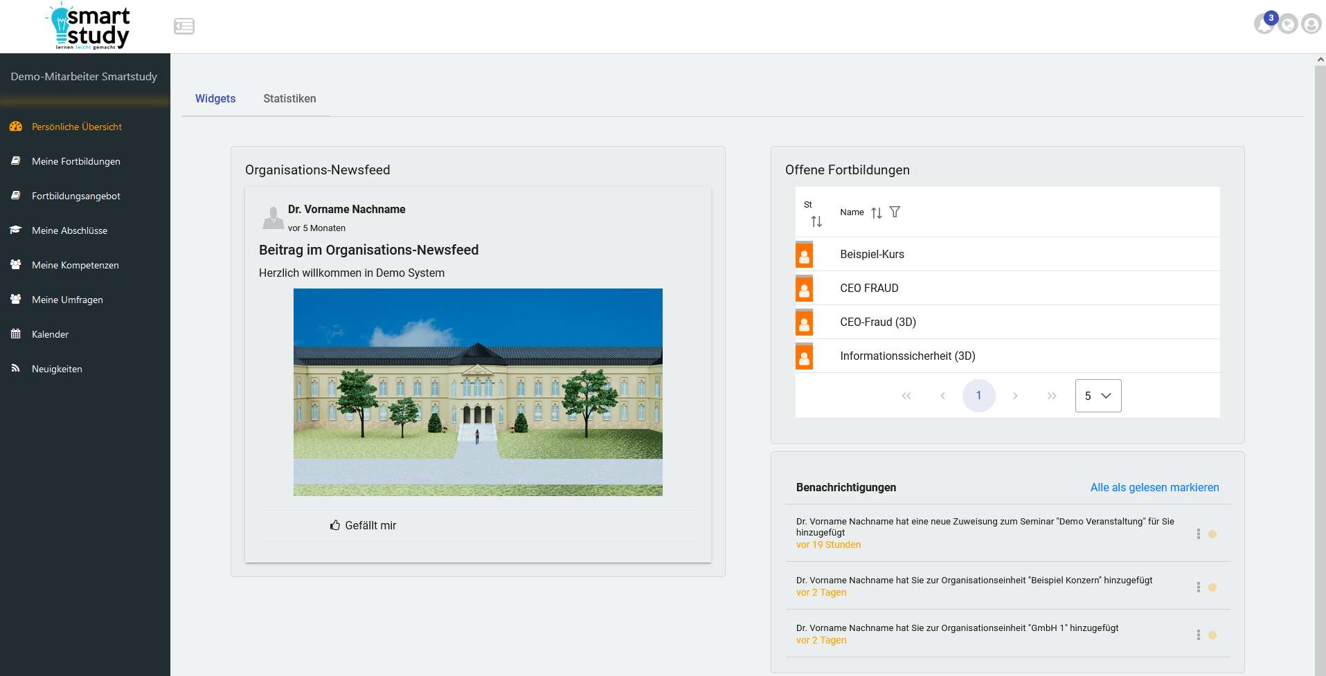 Die Startseite innerhalb des Smart-Study LMS ist die Persönliche Übersicht.