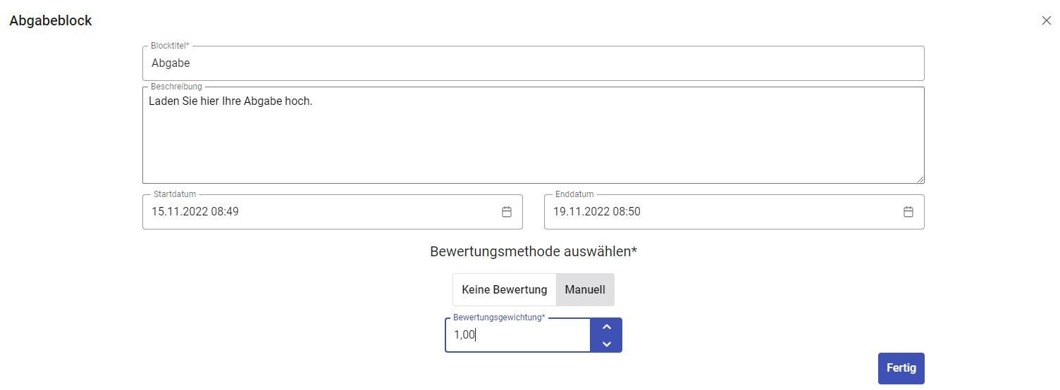 Mit dem Abgabeblock können Sie festlegen, dass die Seminarteilnehmenden eine Abgabe hochladen müssen. Im Titel und der Beschreibung können Sie die Aufgabe erklären. Es kann eingestellt werden, ob die Abgabe eine manuelle oder keine Bewertung haben soll. Wird eine manuelle Bewertung verwendet müssen Sie eine Bewertungsgewichtung für den Abgabeblock eintragen.