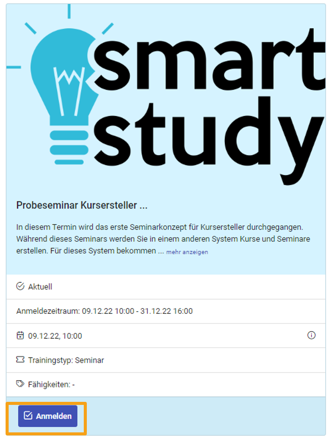 Um sich für ein Seminar anzumelden, gehen Sie zunächst im Menü auf den Punkt Fortbildungsangebot. Dort werden Ihnen alle Seminare angezeigt. Wählen Sie eines aus und klicken Sie auf Anmelden.