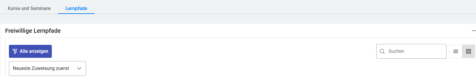 Wählen Sie in “Fortbildungsangebot” den zweiten Tabellenreiter “Lernpfade” aus, erscheinen alle Lernpfade, die Ihnen zur freiwilligen Teilnahme zugewiesen wurden. Sie können entscheiden, wie die angezeigten Lernpfade sortiert werden, im Suchfenster nach Schlüsselbegriffen oder bestimmten Lernpfaden suchen, sowie mit den Icons auf der rechten Seite zwischen Kachel- und Listenansicht wechseln.