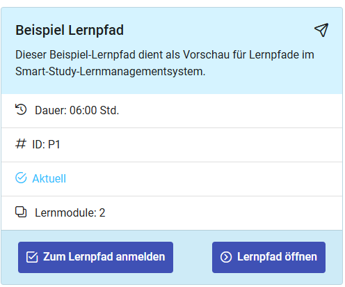 Nutzen Sie die blaue Schaltfläche “Zum Lernpfad anmelden”, um sich direkt zu einem Lernpfad anzumelden, bzw. “Lernpfad öffnen”, um mehr Detailinformationen zum Lernpfad zu erhalten.