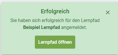 Haben Sie sich erfolgreich zu einem Lernpfad angemeldet, wird Ihnen dies durch ein Pop-up angezeigt. Der entsprechende Lernpfad ist nun nicht mehr unter “Fortbildungsangebot” sondern unter Meine-Fortbildungen zu sehen.