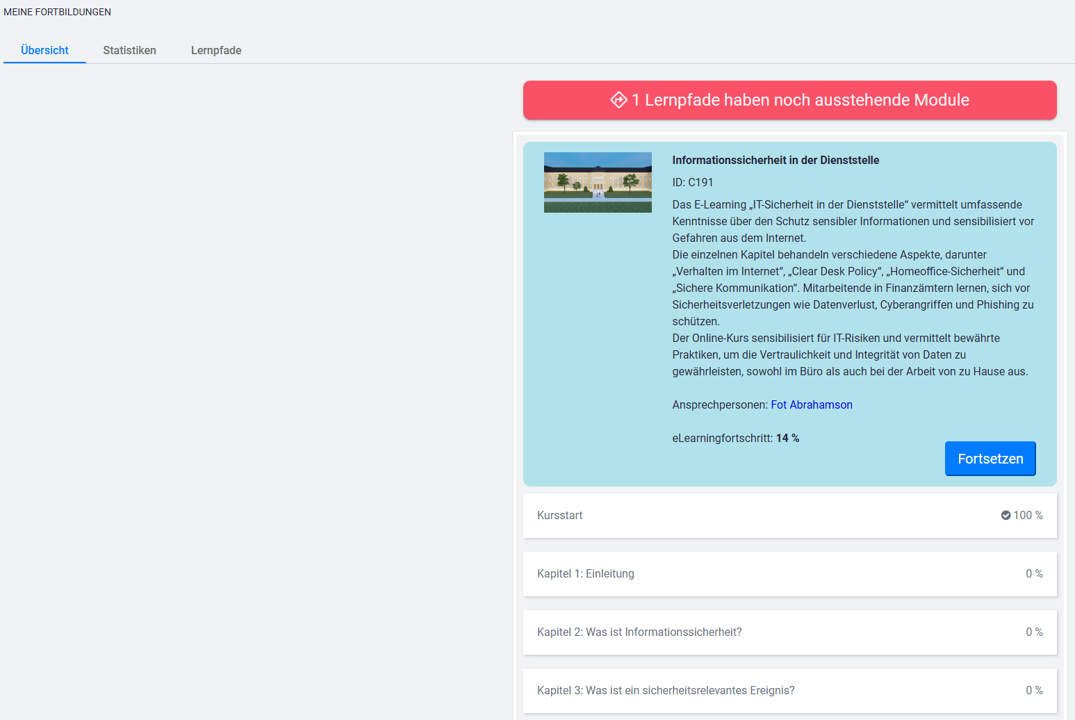 Man kann die verschiedenen Kurskapitel inklusive Fortschrittsanzeige einsehen und mit Klick auf den ‘Fortsetzen’-Button kann man den Kurs direkt fortsetzen.