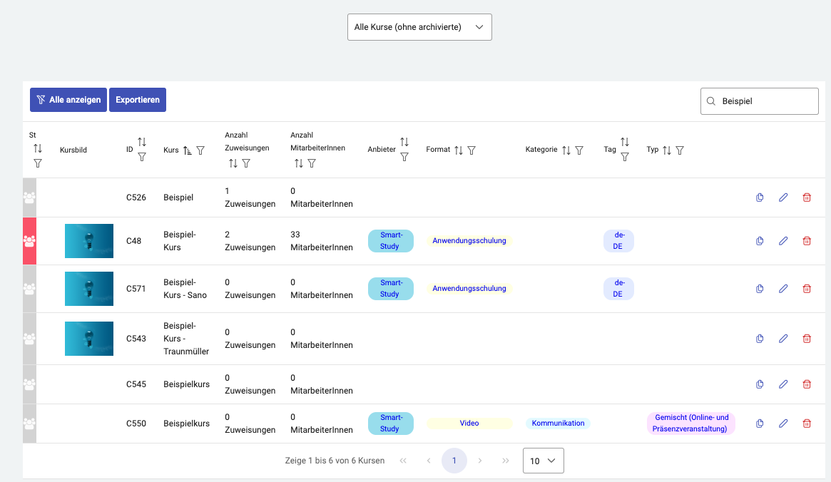 In der Kursliste können wie gewohnt über die Suche einzelne Suchbegriffe gesucht werden und mit dem Button ‘Alles anzeigen’ alle Filtereinstellungen gelöscht werden. Die Kurse können auch nach Mitarbeitendenstatus, Kurs-ID, Kurs-Titel, Anzahl der Zuweisungen und Anzahl von MitarbeiterInnen gefiltert oder sortiert werden. Zusätzlich kann nach Anbieter, Format, Kategorie, Tag und Typ sortiert werden. Die Sortieroptionen sind unternehmensspezifisch konfigurierbar und stehen abhängig von den jeweiligen Einstellungen zur Verfügung.