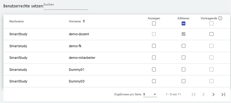 Sie sehen in der Liste alle Ihre KollegInnen innerhalb Ihrer Organisationseinheit und können diesen Personen Rechte an Ihrem Kurs, Seminar oder Lernpfad übertragen.