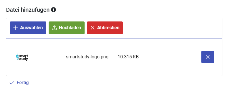 Um eine Datei hochzuladen, klicken Sie auf das Plus und wählen Sie die Option „Datei hinzufügen". Wählen Sie die gewünschte Datei aus und vergessen Sie nicht, auf Hochladen zu klicken, bevor Sie mit Fertig bestätigen!