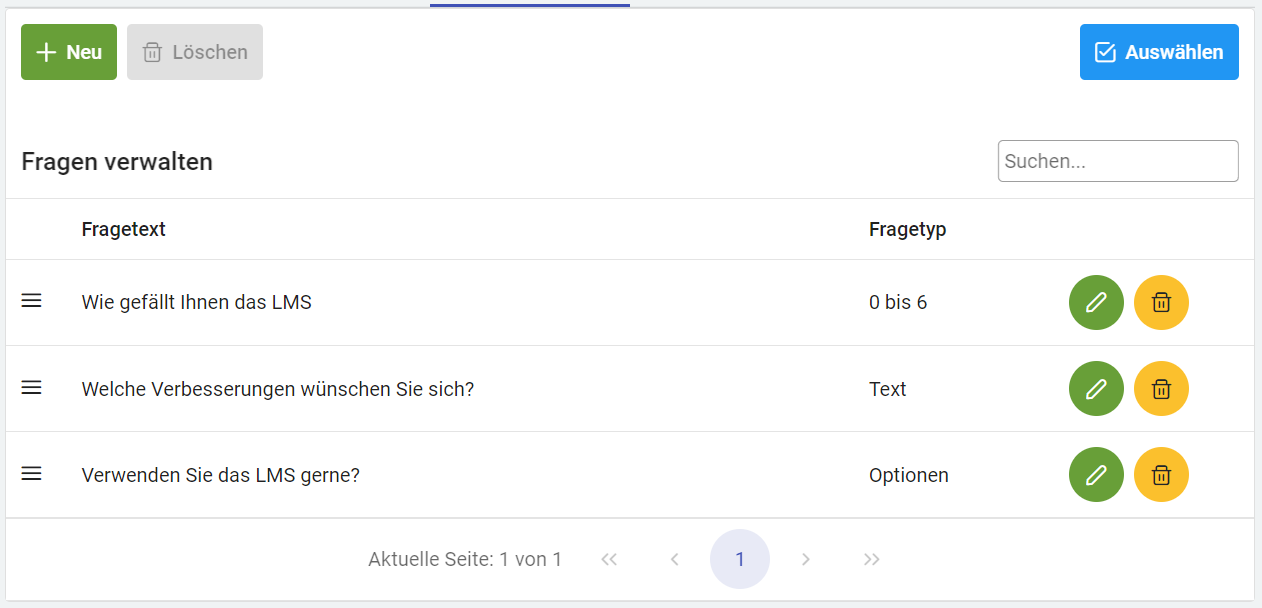 Bei Laden und neue hinzufügen werden die Standardfeedbackfragen zu den bereits von Ihnen erstellten Fragen hinzugefügt.