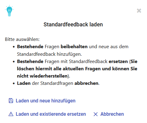 Bei der Option Laden und existierende ersetzen, werden bereits erstellte Fragen gelöscht und nur die Standardfragen scheinen jetzt in ihrem Feedback auf.