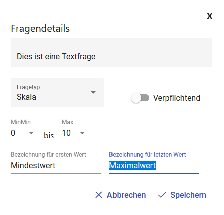 Unter Skala können Sie einen Bewertungsmaßstab, wie bspw. Schulnoten zwischen 1-6, festlegen, in welchem die Teilnehmenden eine Bewertung abgeben sollen. Hier müssen Sie angeben, was der minimale bzw. maximale Wert der Skala bedeuten soll.