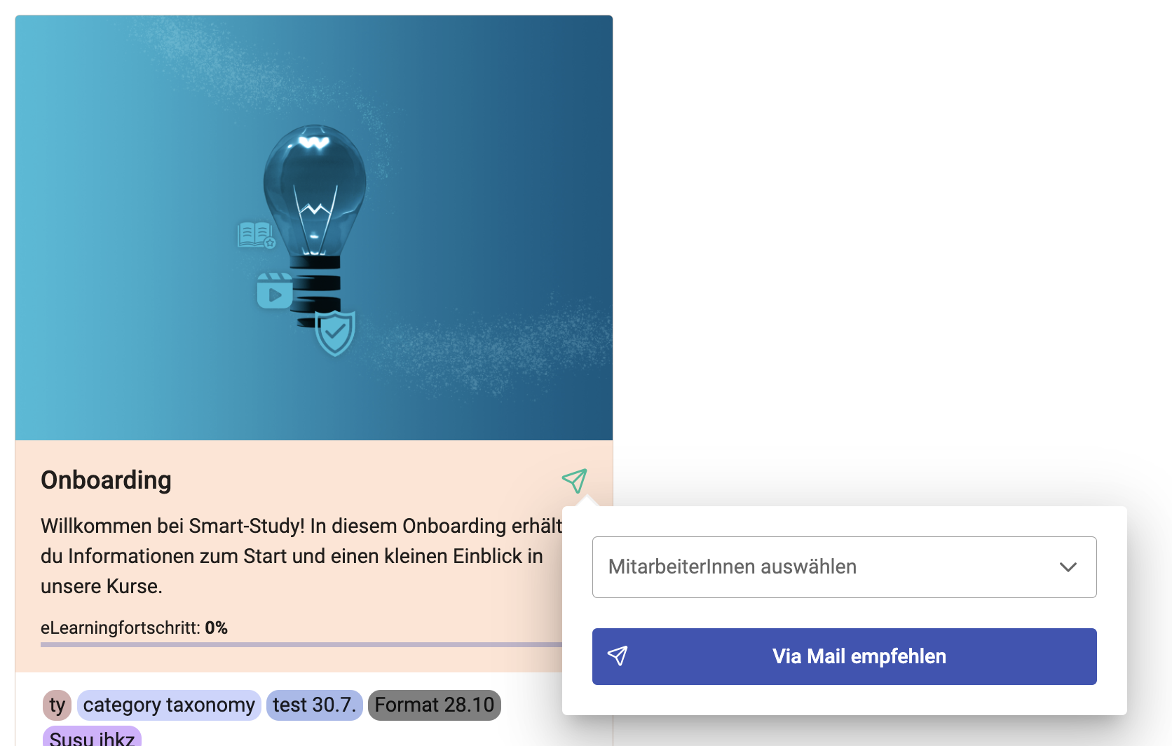 Nach dem Klick auf das Symbol öffnet sich ein Auswahlfeld, in dem Sie eine Person aus Ihrer Organisation auswählen können. Falls keine Auswahlmöglichkeiten angezeigt werden, klicken Sie einfach auf „Via Mail empfehlen“. Sie werden dann automatisch zu Ihrem E-Mail-Programm weitergeleitet und können dort manuell E-Mail-Adressen hinzufügen.