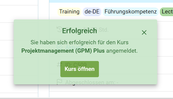 Nach der Anmeldung zu einer freiwilligen Fortbildung erscheint ein Pop-Up, das es ermöglicht direkt die ausgewählte Fortbildung zu öffnen und zu starten. Dies ermöglicht UserInnen flexibel zwischen direktem Fortbildungsstart und weiterem Durchstöbern des Fortbildungsangebots zu entscheiden.