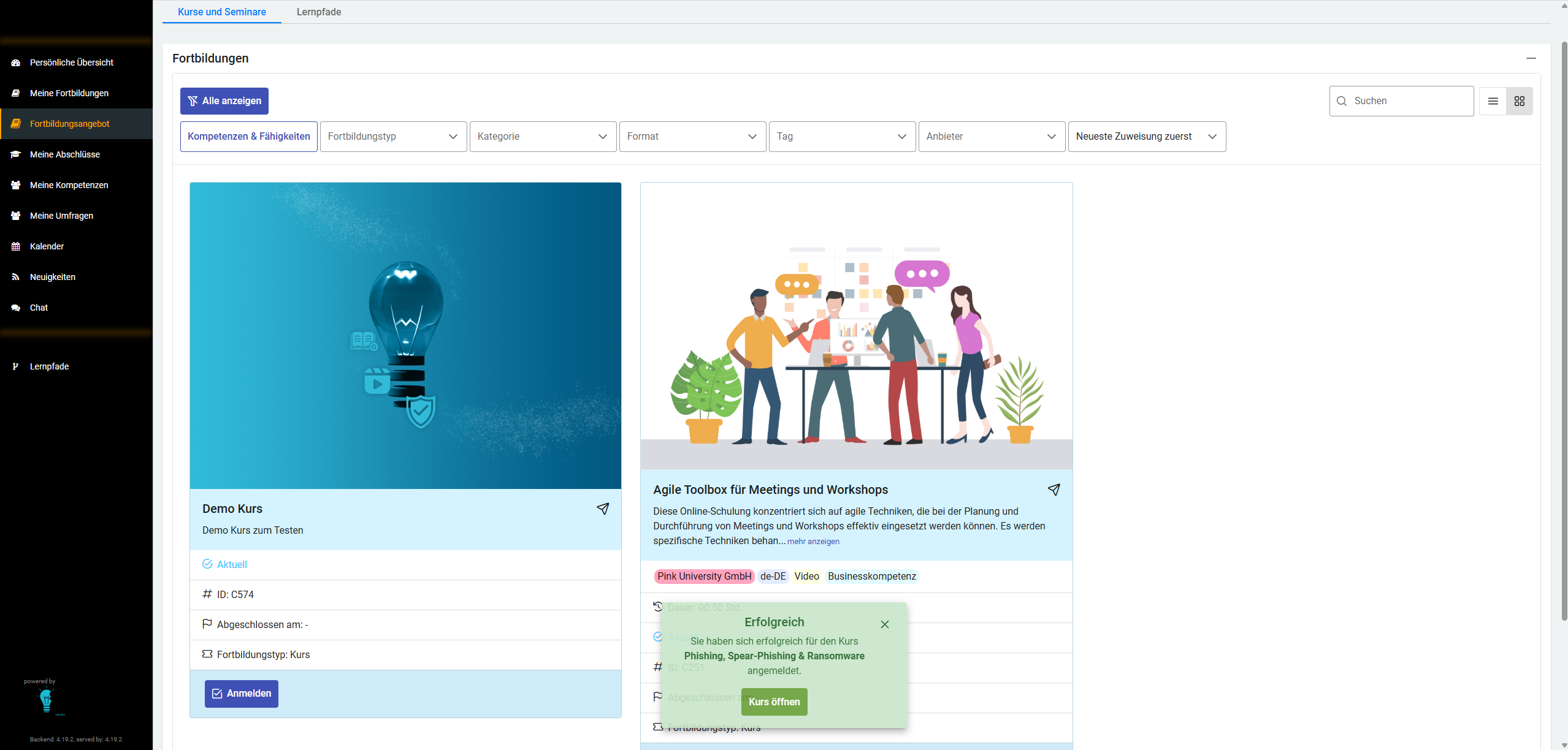 Kurse und Seminare werden im System in zwei getrennten Reitern angezeigt. Es gibt aber auch eine Systemeinstellung, bei der beide zusammengelegt sind und als Fortbildungen gemeinsam angezeigt werden. Lernpfade werden in einem eigenen Reiter angezeigt.
