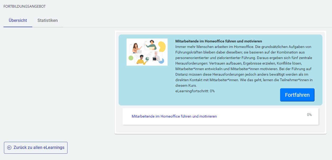 Hier sehen Sie alle Kapitel des Kurses und ob Sie bereits Fortschritte in diesem Kurs erzielt haben. Mit Fortfahren können Sie den Kurs starten bzw. fortsetzen.