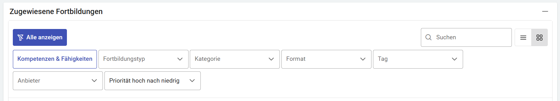 Angewendete Filter werden gespeichert und bleiben auch beim Verlassen der Seite durch Seitenwechsel oder Log-out weiterhin in gewählter Form aktiv. Durch den Alle anzeigen Button können angewendete Filter und Suchen auf einen Klick wieder entfernt und alle zugewiesenen Fortbildungen angezeigt werden.
