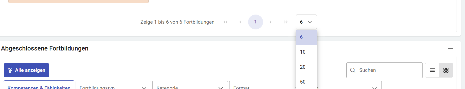 Navigationsleiste Am Ende des Bereichs Zugewiesene Fortbildungen und am Ende des Bereichs Abgeschlossene Fortbildungen finden Sie die Seitennavigationsleisten. Hier sehen Sie, wie viele von wie vielen Fortbildungen Ihnen auf einer Seite angezeigt werden, sowie die Anzahl der gesamt verfügbaren Seiten. Als Standard sind 6 Fortbildungsanzeigen ausgewählt. Mit einem Klick können Sie die Anzahl der angezeigten Fortbildungen pro Seite erhöhen. Dabei haben Sie die Wahl zwischen 6, 10, 20 und 50 Fortbildungen pro Seite. Ihre Auswahl wird gespeichert und bleibt auch beim Verlassen der Seite durch einen Seitenwechsel oder ein Log-Out aufrecht.
