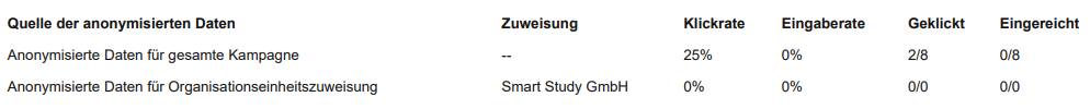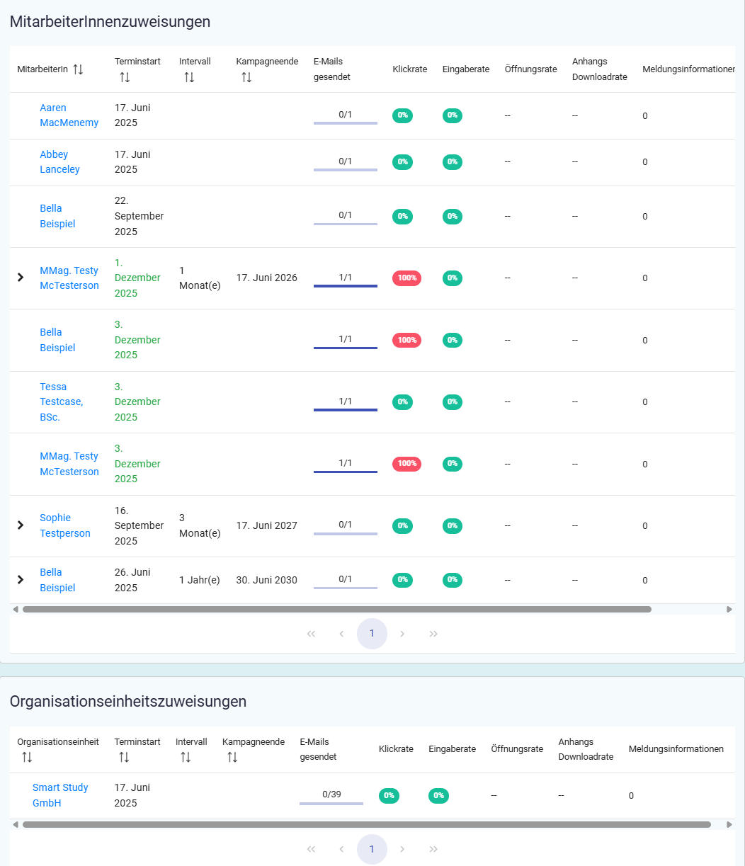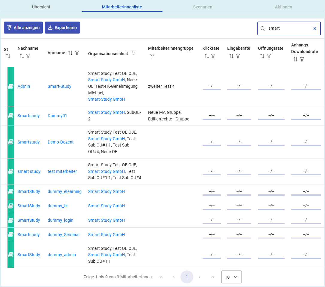 Im Reiter MitarbeiterInnenliste sehen Sie, an welche MitarbeiterInnen die Kampagne zugewiesen wurde. Diese Liste können Sie wie gewohnt nach Namen, Organisationseinheit, MitarbeiterInnengruppe, Klick-, Eingabe-, Öffnungs und Anhangs Downloadrate filtern und sortieren. Ebenso können Sie nach dem MitarbeiterInnenstatus sortiert werden.