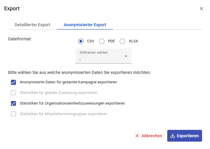 Beim anonymisierten Export können Sie auswählen, ob Sie die Daten für die gesamte Kampagne und/oder Statistiken für Organisationseinheitszuweisungen exportieren wollen: