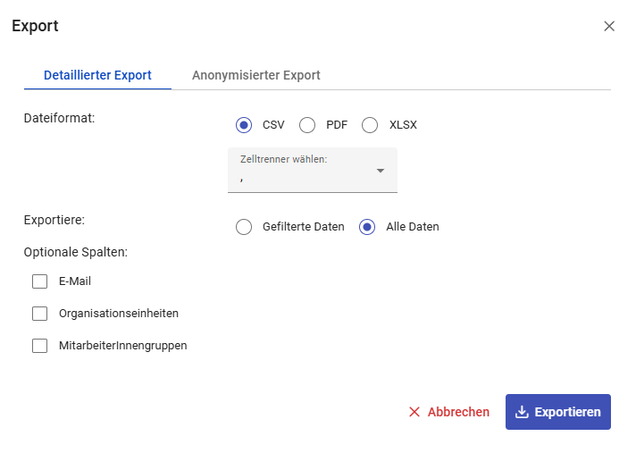 Beim detaillierten Export können Sie zusätzlich einstellen, dass nur die gefilterten Daten exportiert werden und/oder dass die optionalen Spalten E-Mail, Organisationseinheiten und MitarbeiterInnengruppen mitexportiert werden.