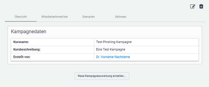 In der Übersicht sehen Sie die Daten der Kampagne und können Sie auch MitarbeiterInnen, Organisationseinheiten oder MitarbeiterInnengruppen zuweisen.