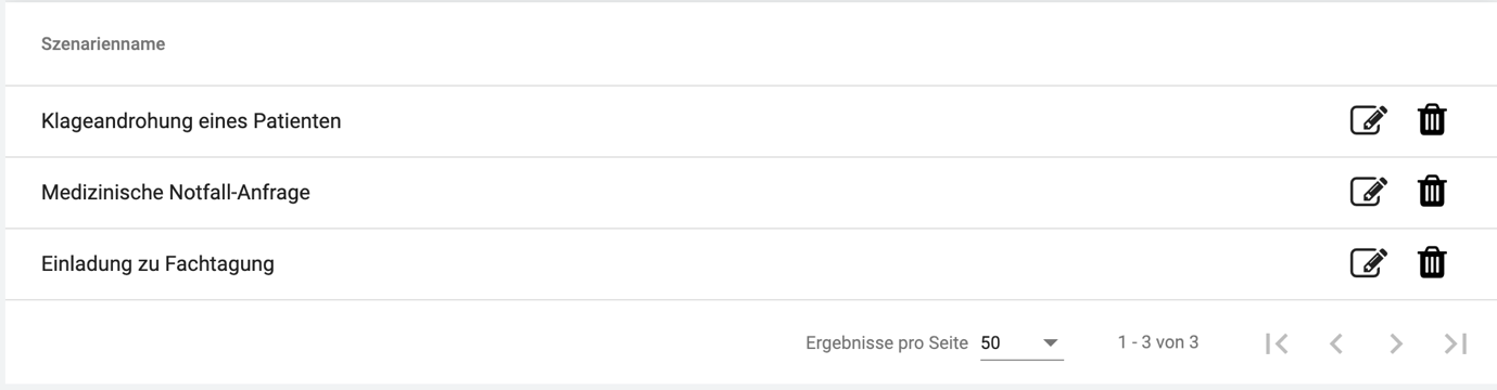 Im Reiter „Szenarien" können Sie alle erstellten Szenarien in dieser Kampagne einsehen. Diese können mit den Buttons recht, bearbeitet oder gelöscht werden.