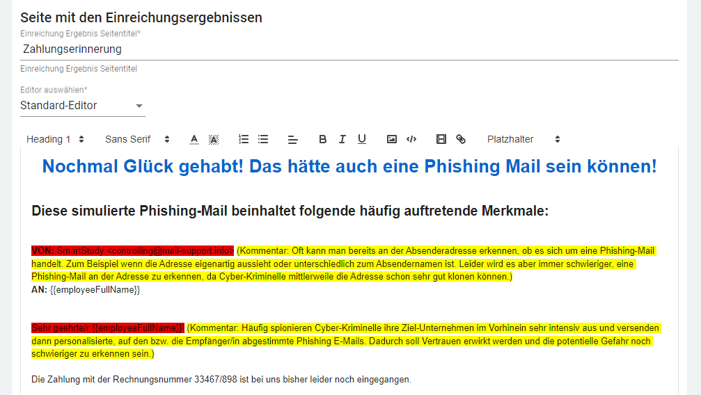 Die Seite mit den Einreichungsergebnissen informiert die NutzerInnen, dass sie einer Phishing-Mail aufgesessen sind, und liefert nützliche Hinweise für den künftigen Umgang mit potenziellen Phishing-Mails. Der Klick des Nutzers wird unter Klick-rate registriert.