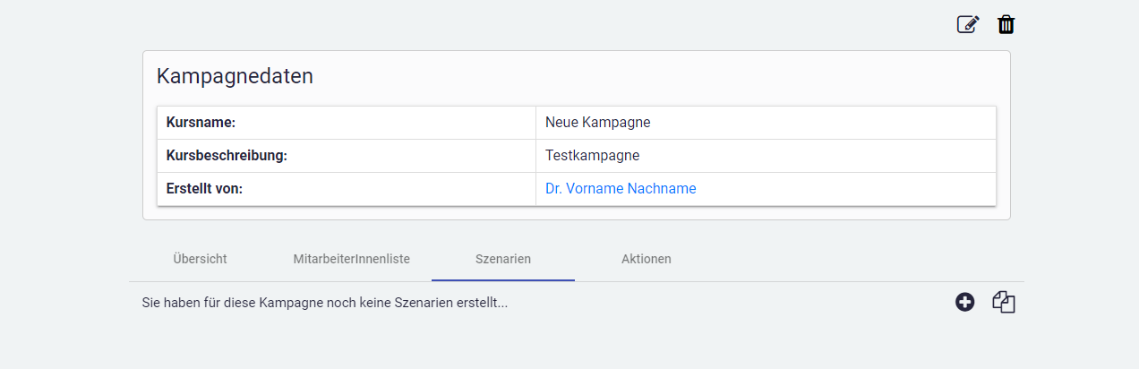 Um ein vorhandenes Szenario zu kopieren, gehen Sie auf die gewünschte Kampagne auf den Reiter Szenarien. Klicken Sie hier auf das Kopieren-Symbol, das sich rechts neben dem Plus-Symbol befindet.