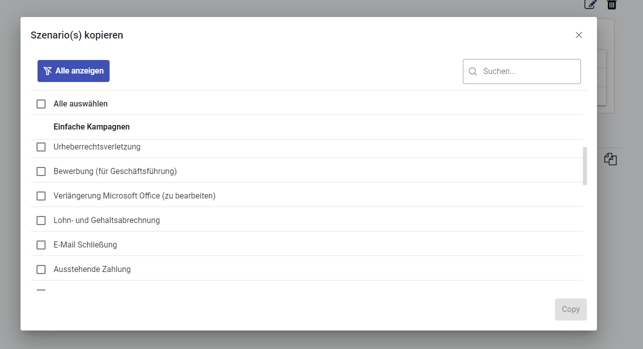Es wird ein Fenster geöffnet, indem Sie die vorhandenen Szenarien, aufgelistet nach den verschiedenen Kampagnen sehen. Hier können Sie die gewünschten Szenarien auswählen und in die gewünschte Kampagne übernehmen.
