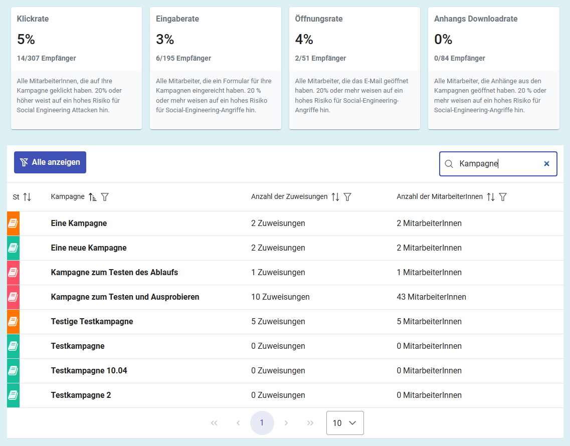 Über der Kampagnenliste sehen Sie die bisherige Klick-, Eingabe-, Öffnungs- und Anhangs-Downloadrate. Die Klickrate zeigt, wie viele NutzerInnen auf den Link der Phishingmails geklickt haben. Die Eingaberate zeigt an, wie viele NutzerInnen ihre Daten auf der Landingpage der Phishing Kampagne eingegeben haben. Die Öffnungsrate zeigt an, wie viele NutzerInnen die E-Mail geöffnet haben. Und die Anhangs-Downloadrate zeigt an, wie viele NutzerInnen die Anhänge aus den Kampagnen geöffnet haben. Diese Angaben beziehen sich auf die gesamten angelegten Kampagnen.