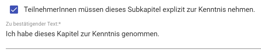 Wenn Sie ‘TeilnehmerInnen müssen dieses Subkapitel explizit zur Kenntnis nehmen’ auswählen, können Sie einen Text eingeben, den alle Kurs-Teilnehmenden am Ende bestätigen müssen.