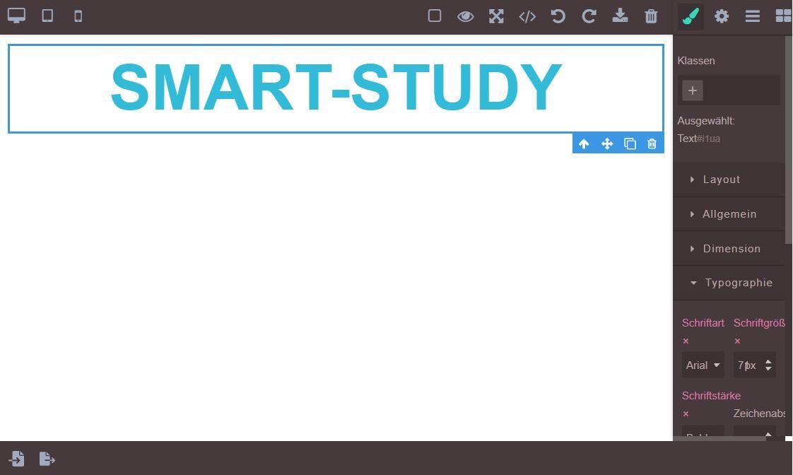 Hier werden die Schriftstärke, Schriftart, Farbe und die Ausrichtung umgestellt. Die ‘Typographie’ bietet eine Vielzahl an weiteren Funktionen, zum Beispiel den Abstand zwischen den Zeichen oder einen Schatten für den Text.