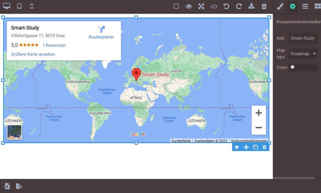 Über das Zahnrad-Symbol ‘Parameter’ gelangen Sie zu den Einstellungen für die Karte. Hier können Sie eine Adresse eingeben und den Zoom einstellen. Es ist auch möglich, zwischen einer flächigen Ansicht, einer ‘Roadmap’, und einer ‘Satellitenansicht’ umzuschalten.