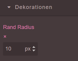 In den Dekorationen kann man Einstellungen zur Umrandung des Blocks machen. In diesem Beispiel ist der ‘Rand Radius’ auf 10px eingestellt. Hier kann man auch die Randbreite, den Rand Stil und die Randfarbe nach Belieben ändern.