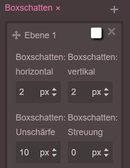 Auch ein Hintergrund und ein ‘Boxschatten’ kann hinzugefügt werden. In diesem Beispiel ist dieser ‘horizontal’ und ‘vertikal’ jeweils auf 2px eingestellt mit einer ‘Unschärfe’ von 10px.