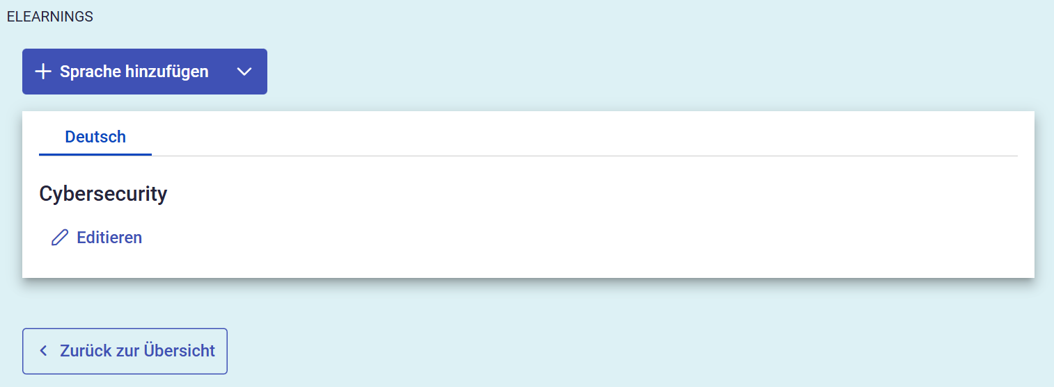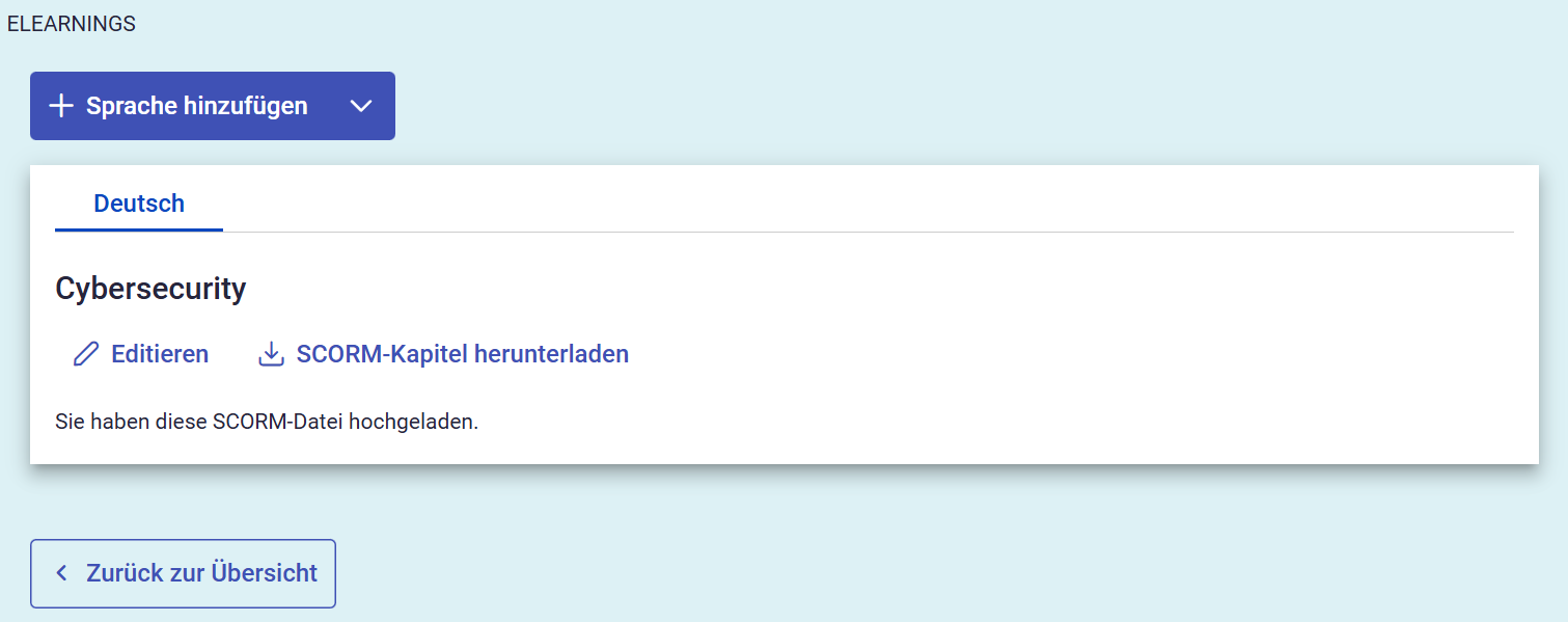 Wenn Sie sich für das Hochladen einer vorbereiteten SCORM-Datei entscheiden, werden Sie zur Sprachauswahl weitergeleitet. Hier können Sie einzelne SCORM-Dateien für die verfügbaren Sprachen hochladen.