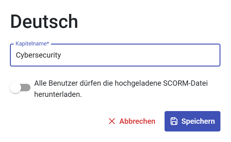 #NEU Nachdem Sie eine Sprache hinzugefügt haben, werden Sie zur Eingabe eines Kapitelnamens aufgefordert. In diesem Fenster finden Sie auch einen Slider, um einzustellen, ob die hochgeladene SCORM-Datei von allen BenutzerInnen, die Editierrechte für den entsprechenden Kurs besitzen, heruntergeladen werden darf. Bleibt der Slider deaktiviert, dann kann die SCORM-Datei neben AdministratorInnen nur von der Person heruntergeladen werden, welche die Datei selbst hochgeladen hat.