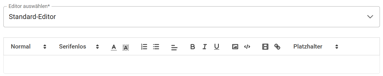 Der Standard-Editor ist ein einfacher Texteditor mit den gängigsten Textformatierungen und Möglichkeiten zum Einfügen von Grafiken, HTML-Code, Video-URLs oder Links.