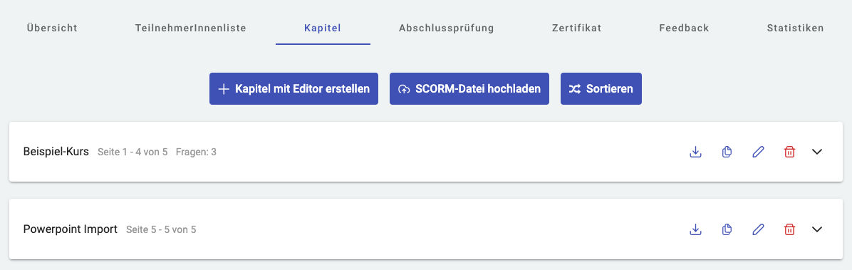 In dieser Ansicht können Sie durch einen Klick auf ‘Editieren’ auch den Kapitelnamen jederzeit ändern und – bei entsprechender Berechtigung – das SCORM-Kapitel herunterladen.