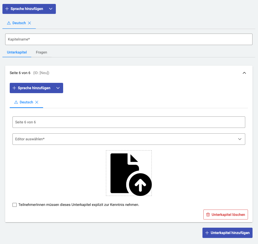 Sobald Sie Ihr Kapitel fertiggestellt haben, fügen Sie es mit ‘Kapitel speichern’ dem Kurs hinzu. Sollten Pflichtfelder nicht ausgefüllt sein, ist das Speichern nicht möglich. Fehlende Angaben sind in roter Schrift gekennzeichnet.
