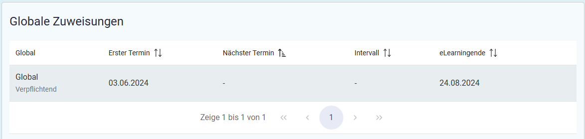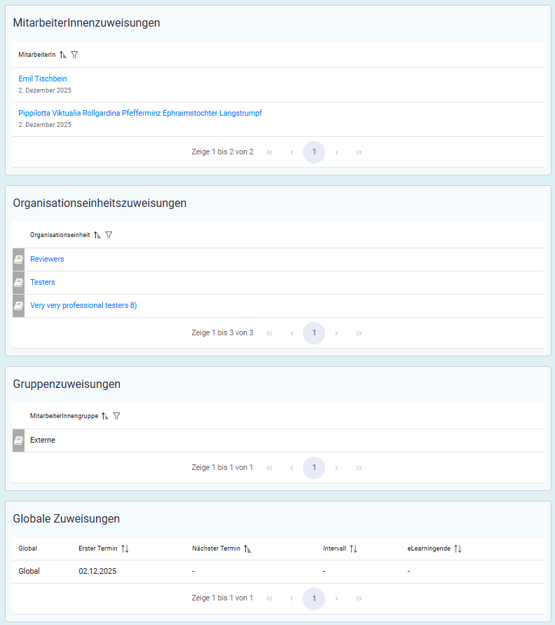 Im unteren Abschnitt sehen Sie, welchen MitarbeiterInnen, Organisationseinheiten und MitarbeiterInnengruppen der Kurs aktuell zugewiesen ist. Falls es eine globale Kurszuweisung für diesen Kurs gibt, wird diese ebenfalls angezeigt.